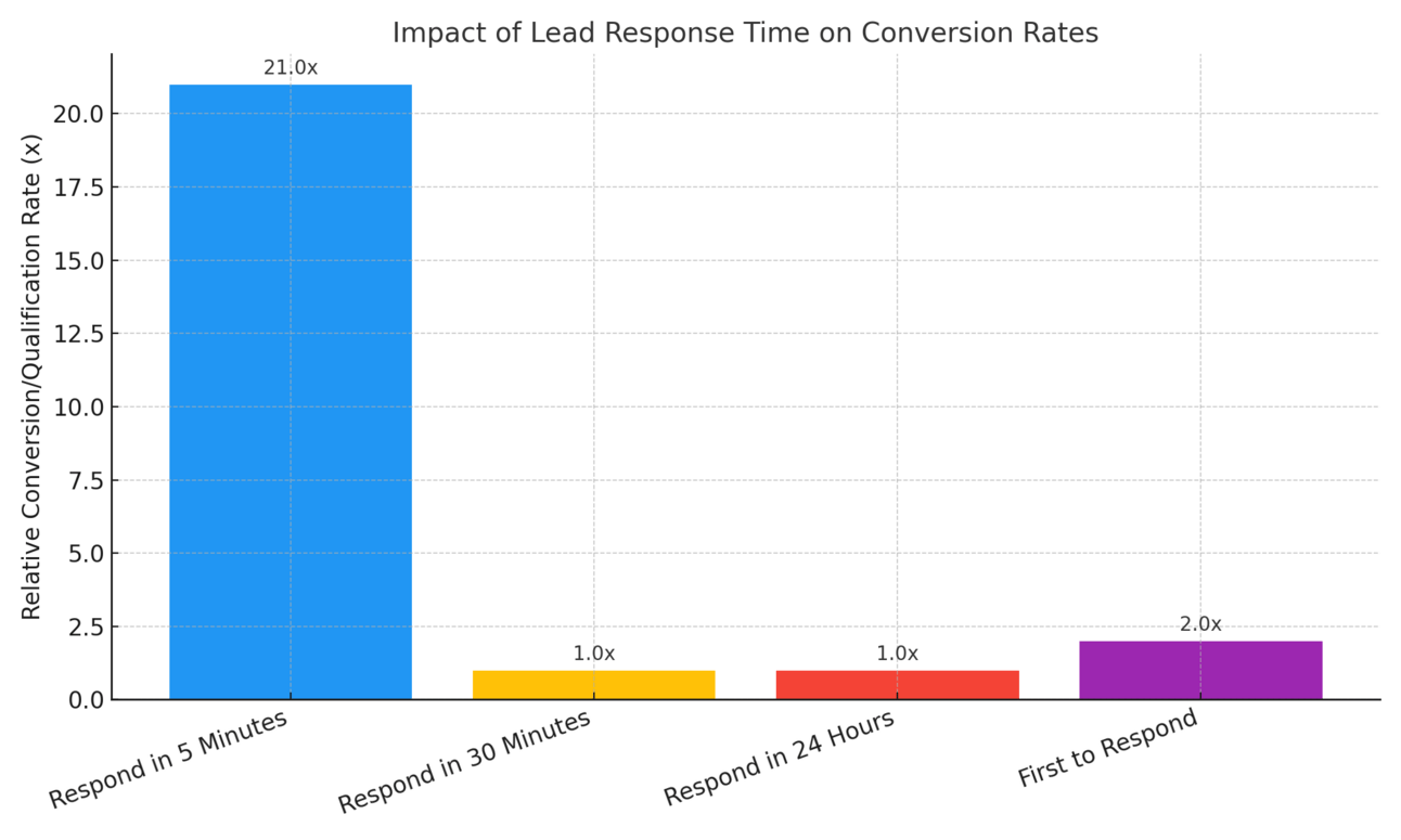 100x Higher Conversion Rate - A 5-minute response time increases conversion rates by 100x compared to a 30-minute delay. (Lead Response Management Study & Harvard Business Review)