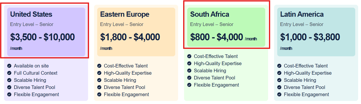 Living in South Africa can be 50–60% cheaper than most U.S. cities, yet the work output is the same. Paying U.S. rates globally blows up your payroll for no extra value.